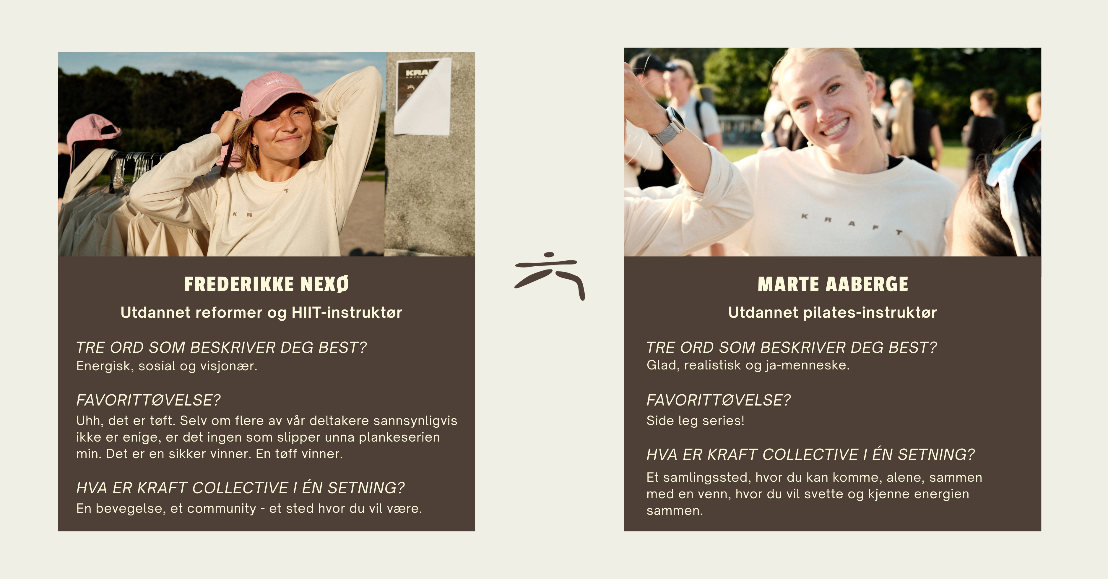 KRAFT COLLECTIVE ble startet i mai 2025 av danske Frederikke Nexø og norske Marte Aaberge. Vi møttes for første gang på et surfebrett på Hawaii – og siden den gang har vi arrangert utallige opplevelser for mennesker som deler vår lidenskap for god energi, bevegelse og et sterkt fellesskap.Vi drømmer om mer enn bare å arrangere treningseventer. Vi vil bygge et aktivt community som Oslo ikke har sett maken til – en bevegelse som bringer mennesker sammen og skaper varige relasjoner rundt noe som er større enn bare trening.